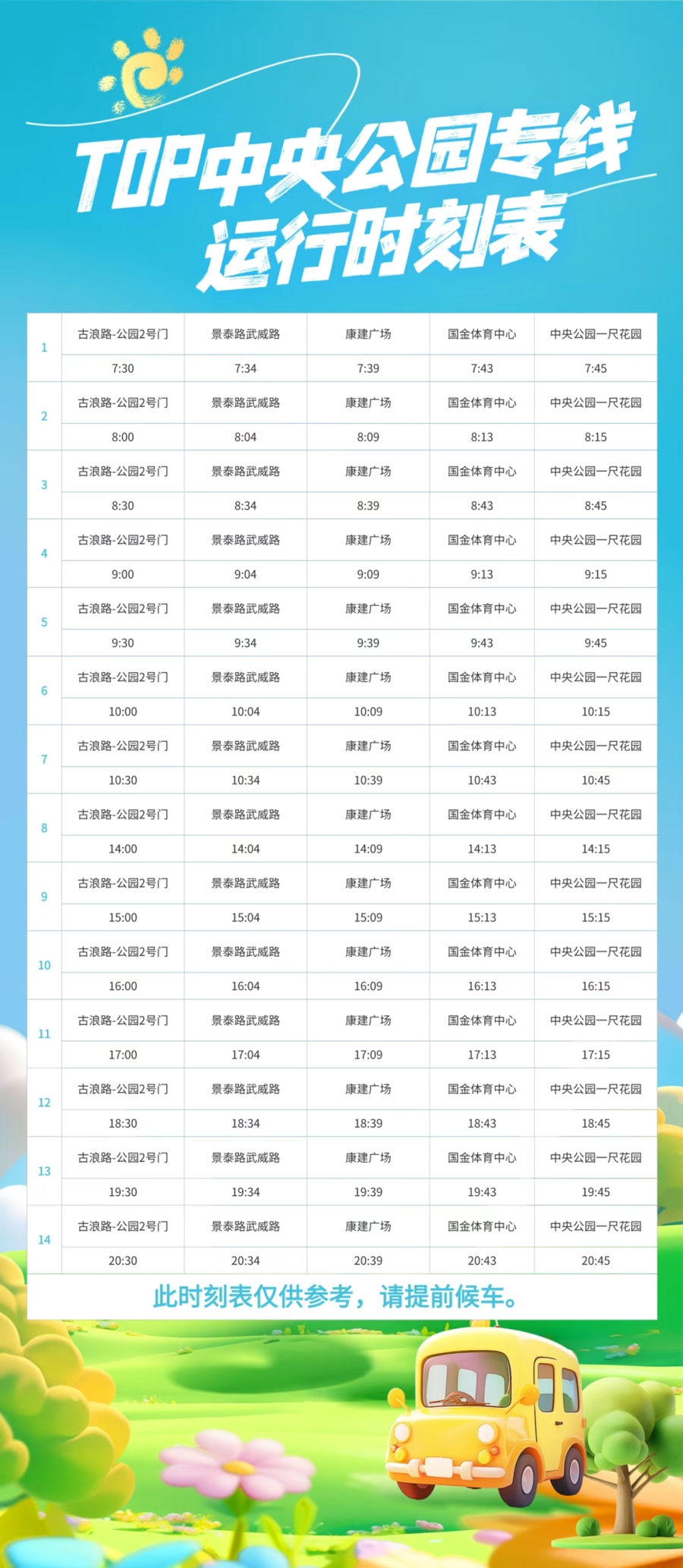 为打通市民畅游公园的“最后一公里”,TOP中央公园专线大巴也于同日启动试运营。该公园专线为环线,市民从地铁11号线祁连山路站出站后,即可免费乘坐。专线全程约7公里,运营时间为周末及法定节假日的早上7点半至晚上8点半,沿线共设有5个站点,依次为:古浪路公园2号门、景泰路武威路、康建广场、国金体育中心、中央公园一尺花园。