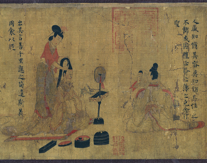 现存于英国大英博物馆、传为东晋时期顾恺之所绘的《女史箴图》,记录了当时人们使用铜镜梳妆的情景,其中右侧一人手持铜镜,对镜照容;左侧一人则跽坐于悬挂在镜架上的铜镜之前,侍女正为其梳理头发。《女史箴图》上的这一场景,集中表现了中国古代铜镜最主要的两种使用方式——手持以及用金属、木质或其他材质的装置放置或支撑铜镜。