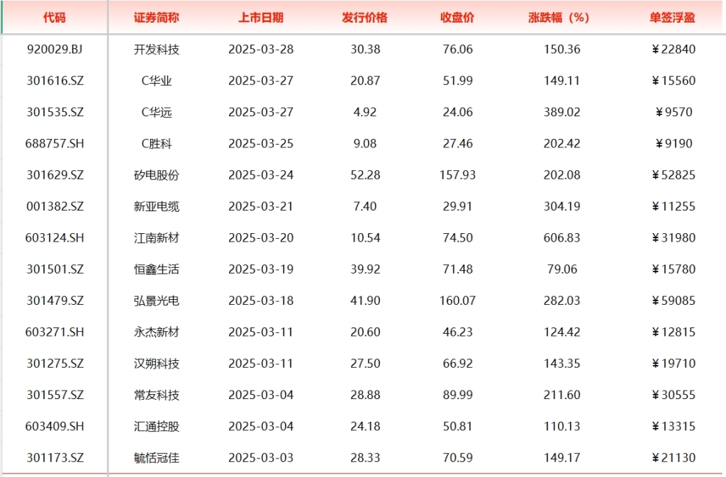 3月打新收益迎“小阳春”:首日平均中一签浮盈2.3万,2股收益超5万