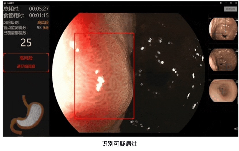此外,“内镜精灵”还具备盲区监测功能,可确保检查全面无遗漏。它依照消化内镜检查的诊疗规范,将人体消化道绘制出 “地形图”,标识出必查的 “坐标点”,自动识别监测胃镜检查盲区的平均准确度高达95.3%,并及时提醒医生检查遗漏部位。同时,它能监控内镜退镜速度,规范操作流程,避免因操作不当导致的漏诊风险。不仅如此,“内镜精灵”还能抓取并储存各部位典型图片,自动生成患者的图片报告,大大提升了工作效率。