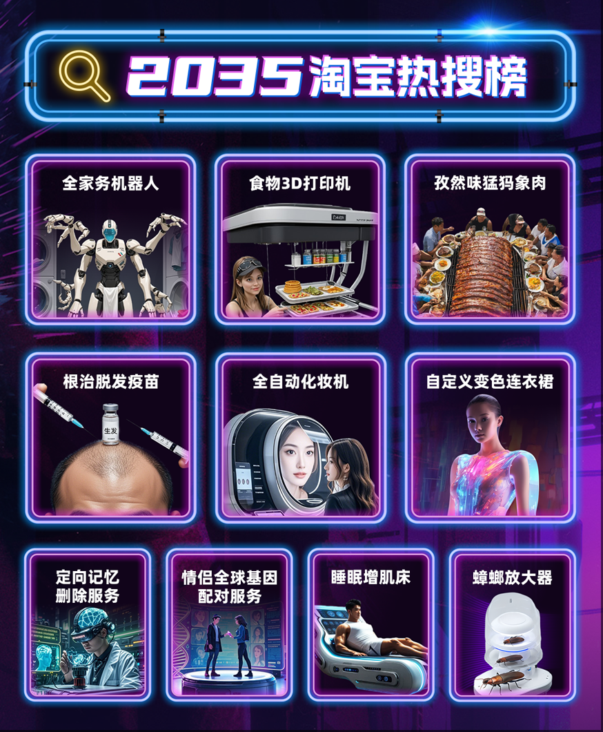 3月31日,在愚人节前夕,淘宝以独特视角开启了一场跨越时空的商业想象,其AI实验室通过整合消费者行为数据及前沿科技,预测出这份充满科幻色彩的《2035淘宝热搜榜》。行业人士认为,这份看似荒诞的清单,实则暗藏未来十年技术演变与消费趋势的密码。