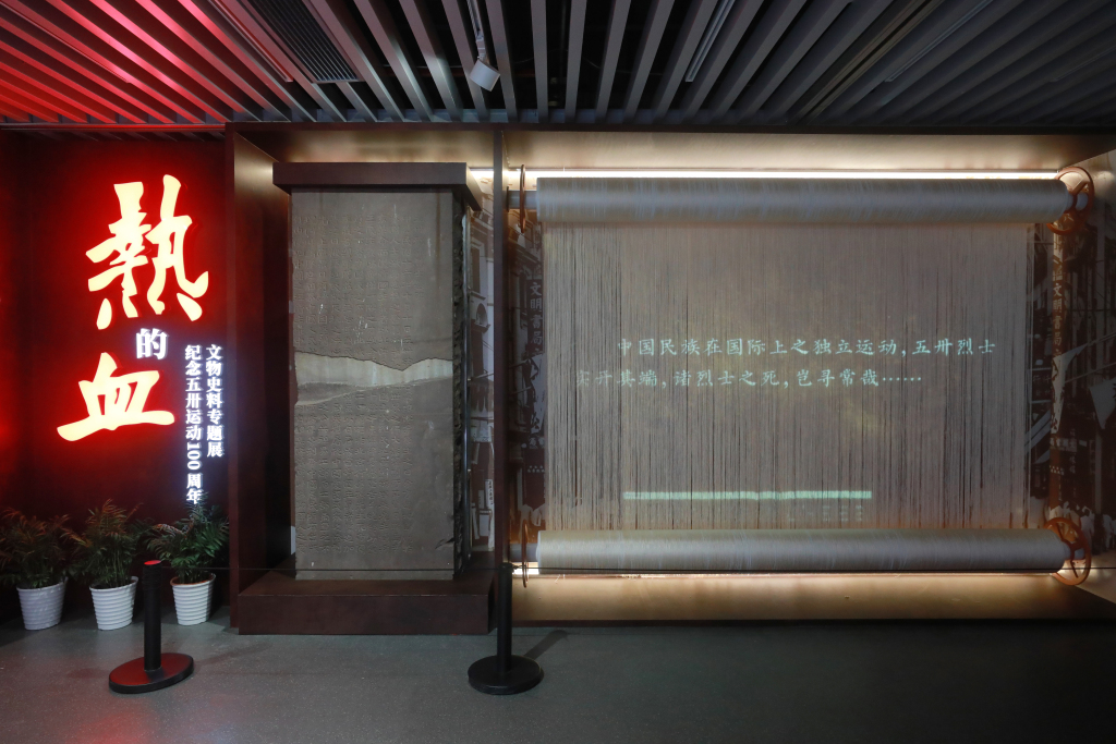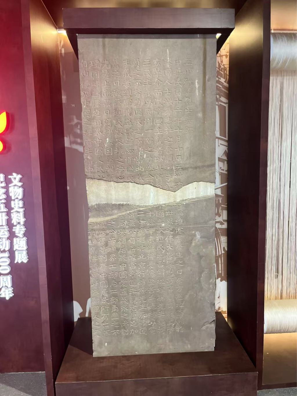 “五卅殉难烈士墓碑”展出:碑文由蔡元培撰写,碑身曾被炸断