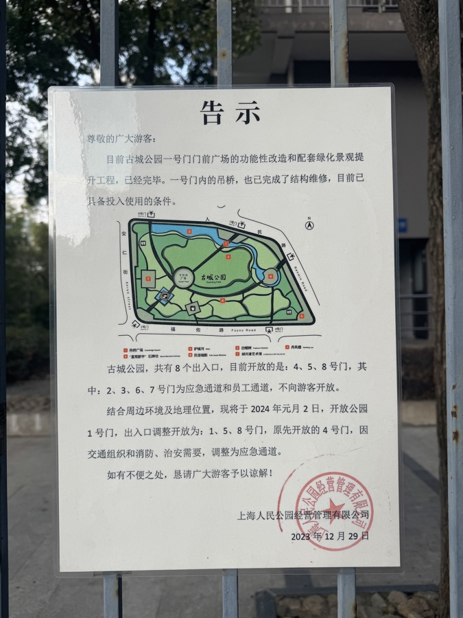 周边居民鞠女士说,4号门此前是开放的。4号门外的一张告示也验证了这点。这张落款日期为2023年12月29日的告示显示,古城公园共有8个出入口,2024年2月前,由于1号门功能性改造,所以开放4、5、8号门;从2024年2月起,1号门改造完毕重新开放,而4号门因“交通组织和消防、治安需要,调整为应急通道”。
