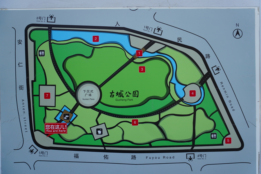 公园门口和内部的大地图上,标数字的出入口有1、4、5、8,分别位于四角,看起来设置很合理。