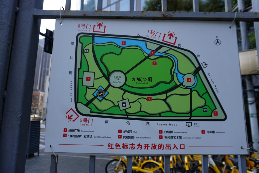 古城公园门口和内部设置的大幅地图显示,公园在人民路近安仁街设有8号门、安仁街近福佑路设有5号门、福佑路近人民路设有4号门,以及公园东北角设有1号门。根据这一设置,梯形公园的每个顶点各有一个出入口,不论是市民游客进入公园观光游览,还是路人借道公园前往周边区域,都比较方便。