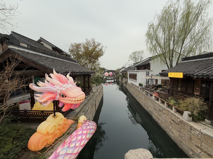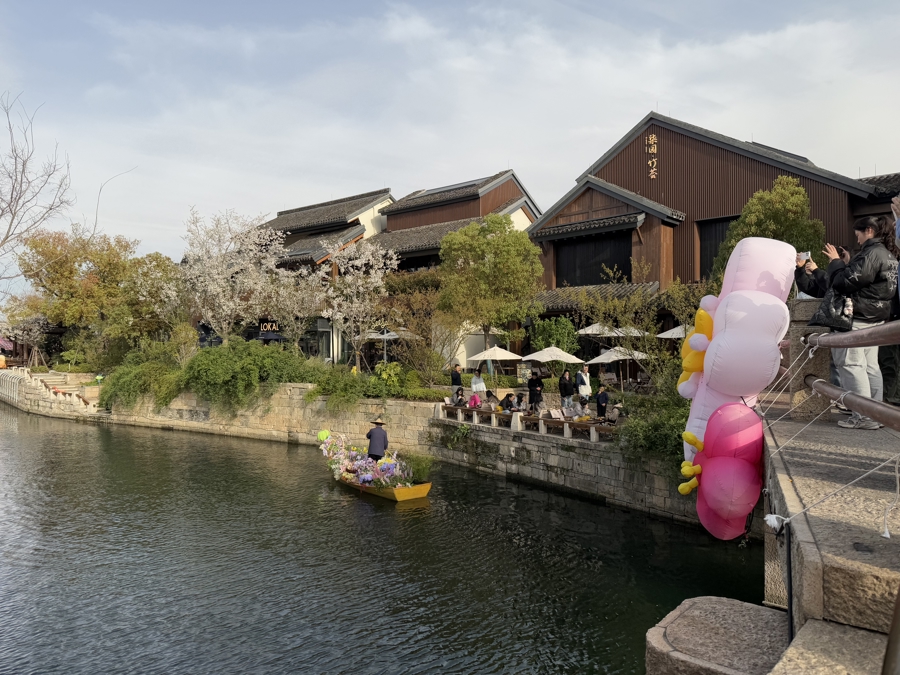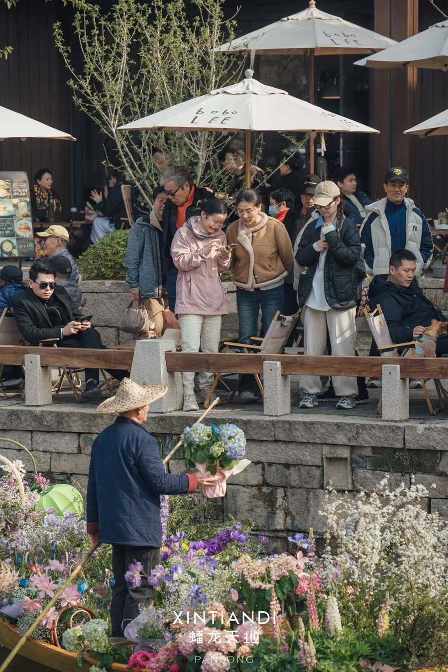 在蟠龙天地,很容易看到这样一番景象:打扮入时的年轻人,穿过江南风貌的青石板小路,坐在古桥岸边的外摆位上吃着西式Brunch(早午餐),看着船工撑着摇橹船从桥洞下穿过。