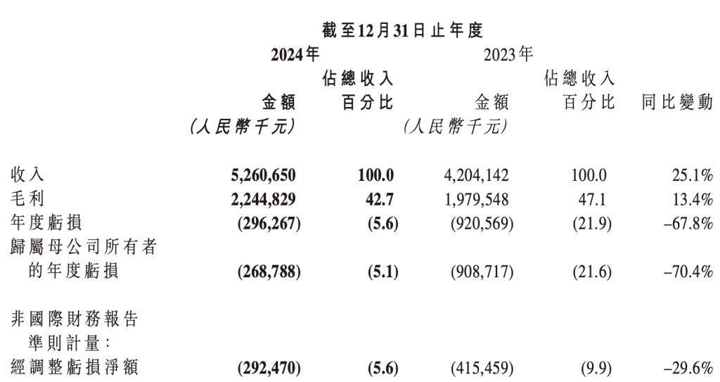 3月31日,人工智能企业北京第四范式智能技术股份有限公司(第四范式,06682.HK)发布2024年年度业绩,全年总收入52.61亿元,同比增长25.1%;毛利22.45亿元,毛利率42.7%;同时,实现连续四年减亏,归母净亏损2.7亿元,较2023年同比减少6.4亿元,收窄70.4%;研发投入21.7亿元,研发费用率为41.2%。