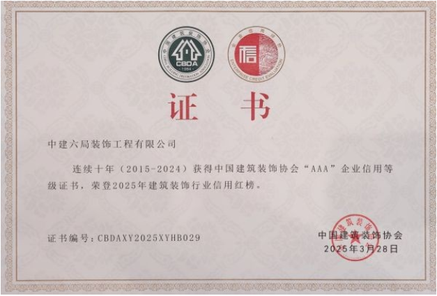 连续十年AAA信用等级认证,是对中建六局装饰工程有限公司综合实力的高度认可。未来,我们将继续秉持“诚信、奋进、卓越、共赢”理念,积极响应国家绿色发展号召,推动装饰行业转型升级,持续“拓展幸福空间”,以更高标准助力城市建设与民生改善,履行央企社会责任。(徐栩)