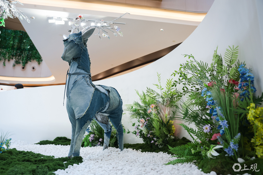 艺术家融合非遗花丝盘丝工艺与再生艺术,用废旧钢筋、废弃玻璃瓶、牛仔布等材料制成树状雕塑和“机械鹿”,为观众带来沉浸式体验。