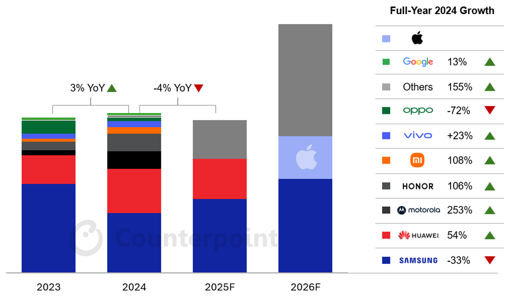 Counterpoint报告称,尽管许多手机制造商实现了两位数乃至三位数的增长,但三星因政治不稳定因素导致第四季度业绩不佳,影响了市场的整体增长。同时,三星折叠机在轻薄续航等产品力上也缺乏竞争力。