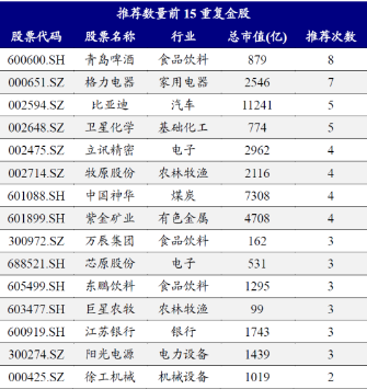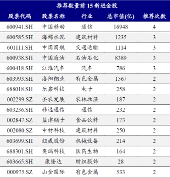 医药生物板块为益方生物、奕瑞科技、神火股份,合计均被推荐了2次;汽车板块为比亚迪,合计被推荐了5次;通信板块是中国移动,合计被推荐了4次。