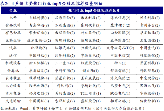 开源证券研报统计结果也显示,4月券商金股权重最靠前的行业为电子,且占比高达10.8%;食品饮料紧随其后,占比为7.1%;有色金属、医药生物位居其次,占比均为6.5%。