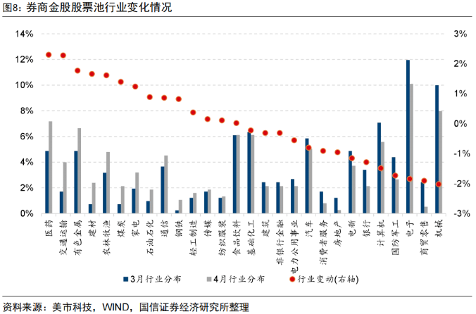 国信证券研报数据指出,从相对变化来看,券商4月金股在医药、交通运输、有色金属等行业的增配较多。