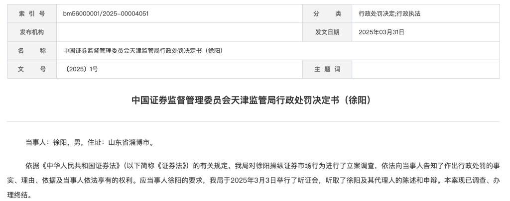 近日,天津证监局新增一份行政处罚决定书,因操纵证券市场,徐阳被没一罚三,合计罚没收入约3.96亿元。