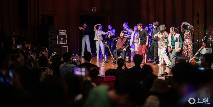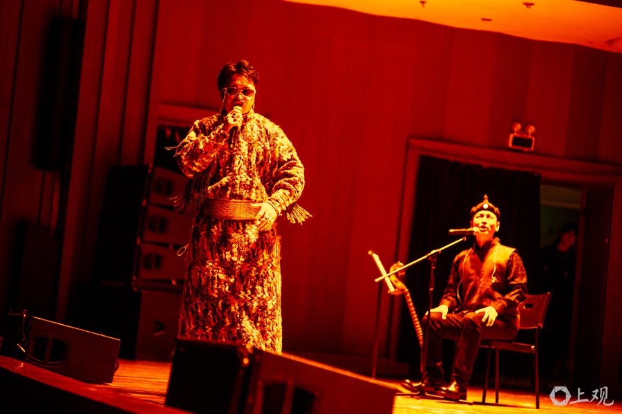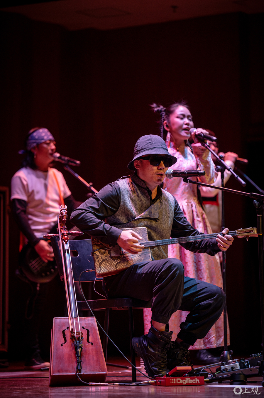 4月1日晚9点,贺绿汀音乐厅,在蒙古草原风的音乐和摇滚音乐元素的铺垫中,观众们凑到台口,或举起手高喊,或举起手机记录眼前的场景,或上台把激情演奏中的乐手团团围住,载歌载舞,这个上海春日的凉夜被瞬间切换到了蒙古包前的那达慕模式。