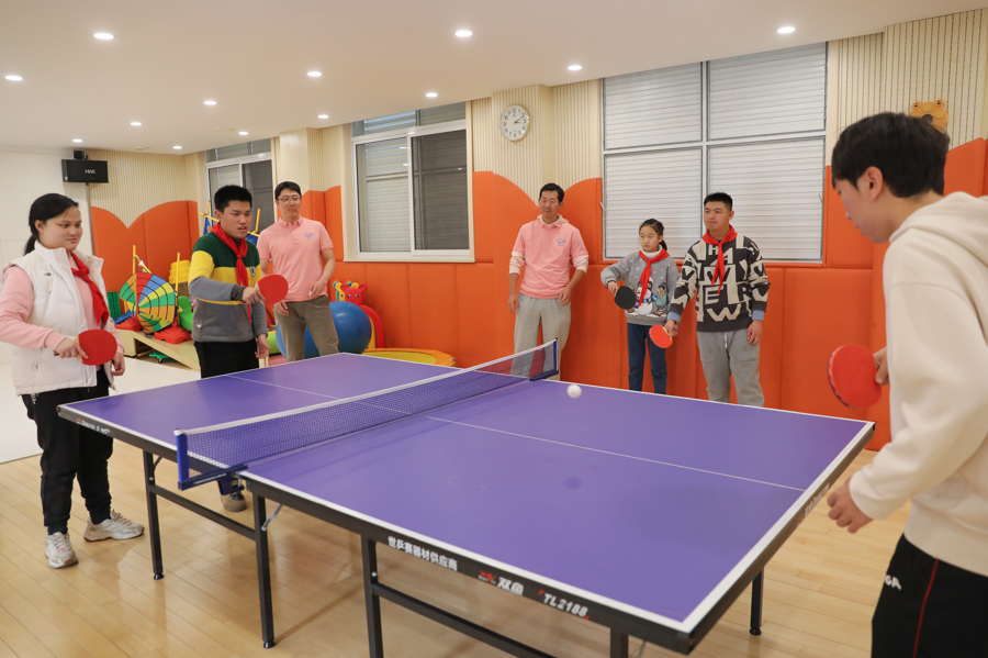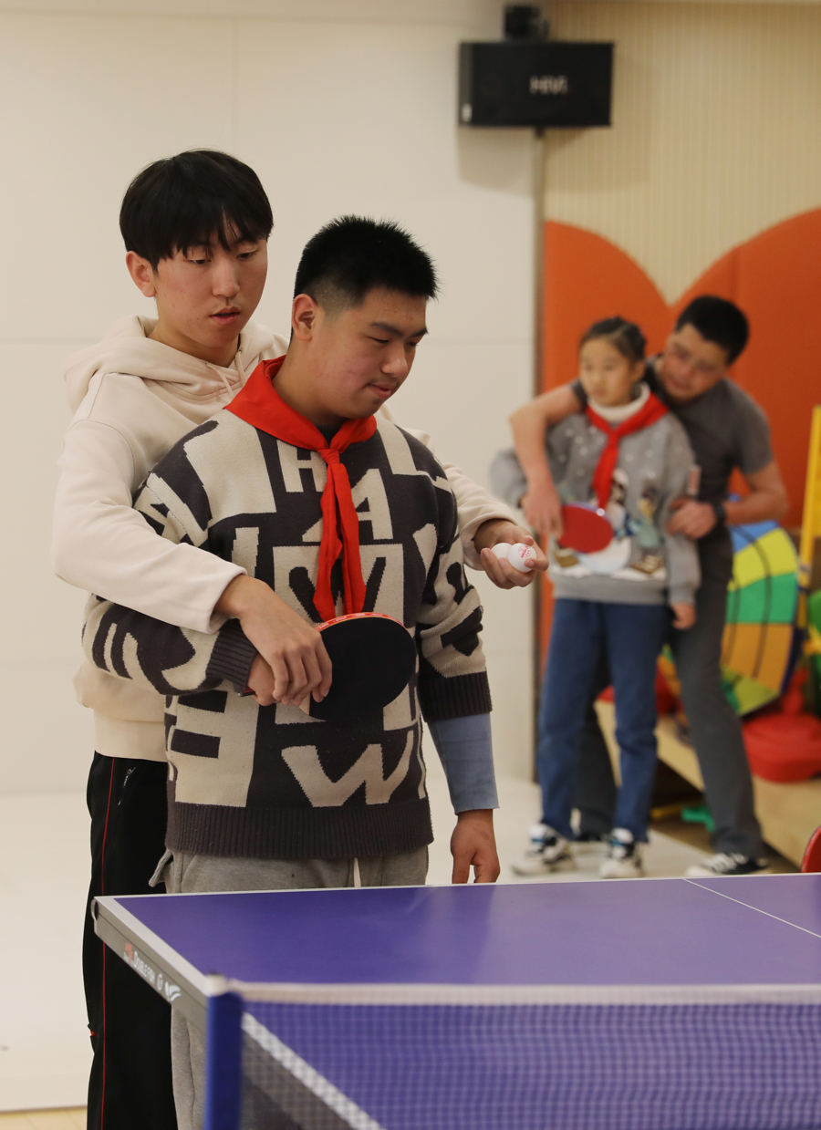 球桌旁,作为教练的刘方佳仔细观察着3名学生的一举一动,时不时亲身示范、纠正错误。刘方佳就读于上海体育大学运动训练专业,是名大二学生。不久前,他向黄浦区残联主动报名,成为了指导这些特殊学生训练的志愿者,还制定了详细的训练计划——热身、正反手练习、对打等。刘方佳注意到,相比于正常的同龄人,特殊学生的理解能力偏弱,注意力更容易分散。为此,他反复强调要点,让他们一遍遍重复正确动作,加深印象。令他欣喜的是,刻苦的练习已见成效,“上周,他们还在原地‘站桩输出’,如今已经能满场灵活跑动了”。
