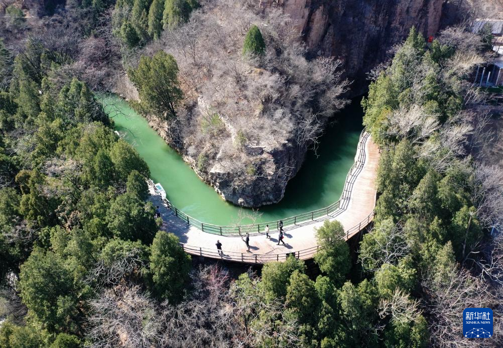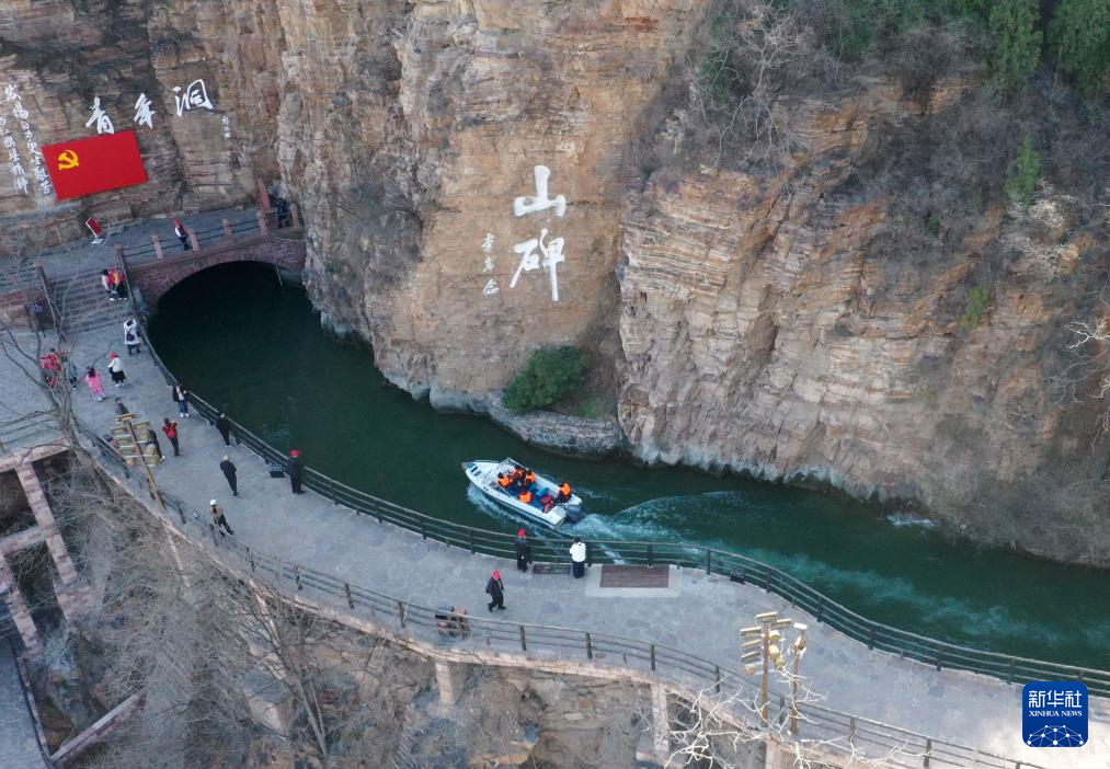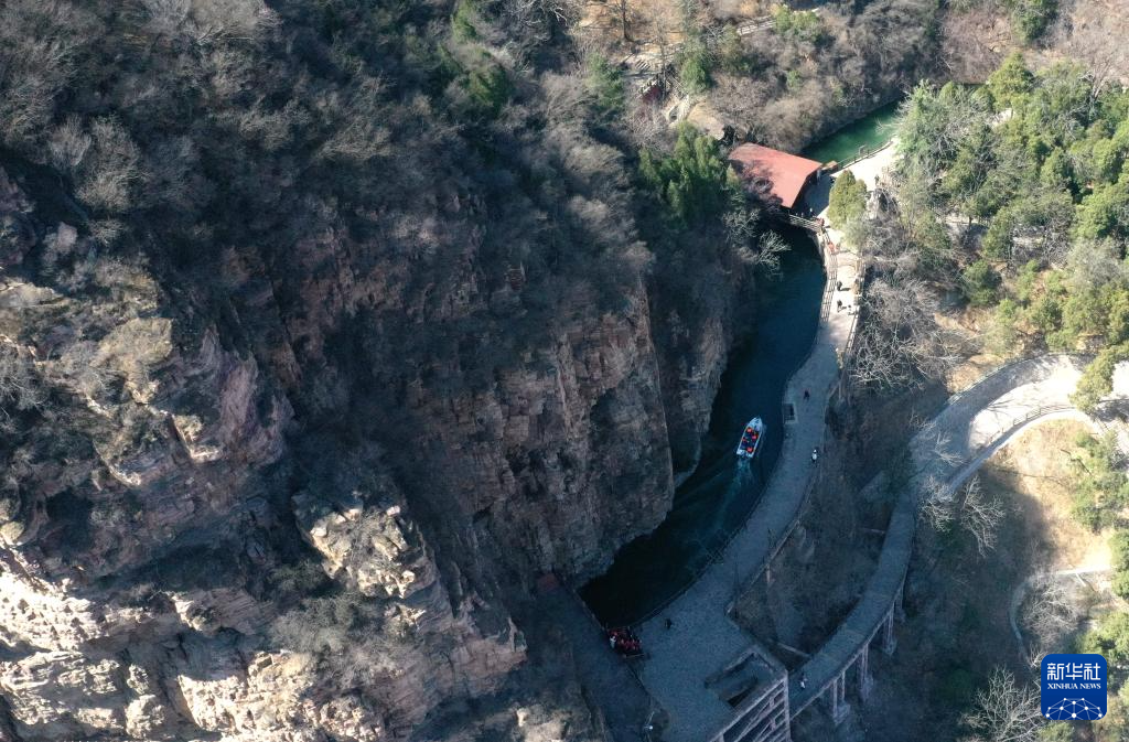3月18日,游客在红旗渠风景区青年洞附近游玩(无人机照片)。