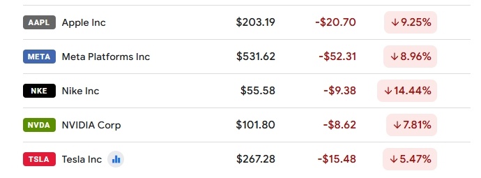 个股方面,跨国企业股票跌幅尤为明显,其中耐克和苹果分别跌超14%和9%;科技股也普遍受重挫,英伟达跌近8%,特斯拉跌超5%,Meta跌近9%。