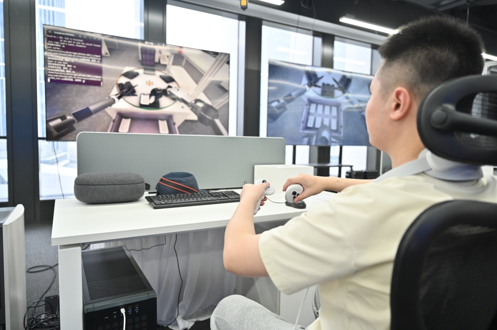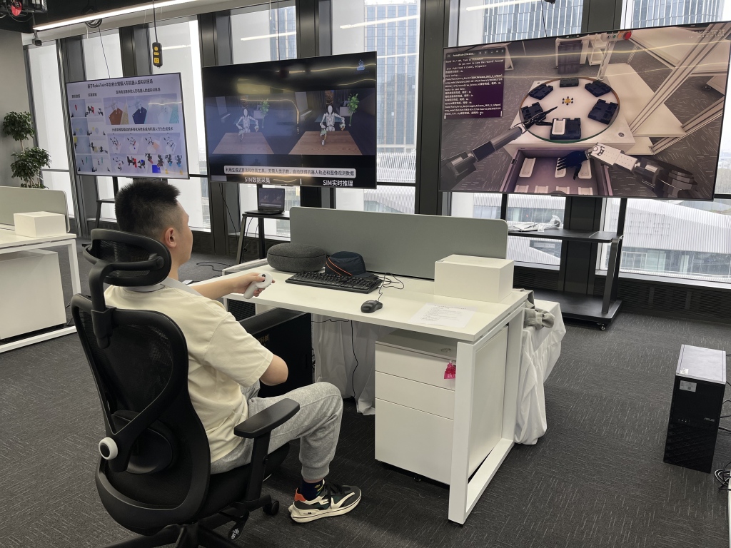 走进国地中心,首先映入眼帘的,是数据采集员坐在电脑面前,两手交替训练机器人做抓的动作,电脑屏幕上,一个虚拟的人形机器人双臂“复刻”数据采集员的动作,不断练习如何“抓”。