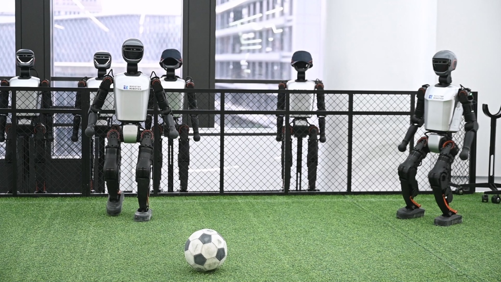 人形机器人正在进行足球“训练”。澎湃新闻记者 张呈君 摄