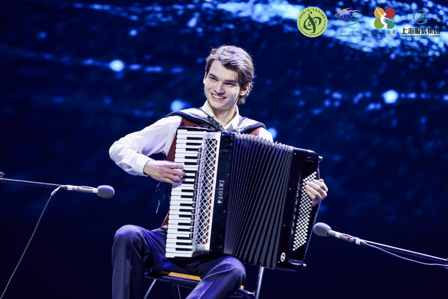 紧接着登场的是有“琴键上的冒险家”美誉的第77届世界杯手风琴锦标赛流行音乐表演组冠军、俄罗斯青年手风琴演奏家尼基塔·库兹涅佐夫,他带来了俄罗斯民间舞曲《巴里尼亚》《阳光》以及改编自肖邦作品的《升C小调圆舞曲的玩笑》。