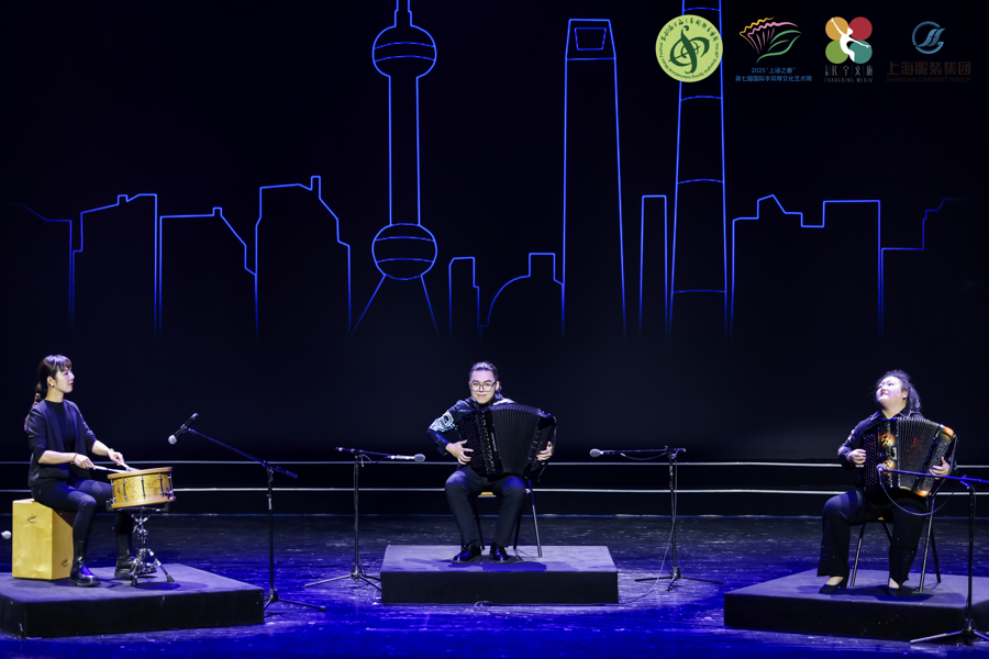 中国艺术家也精彩登场。为上海摘得第77届世界杯手风琴锦标赛世界音乐重奏组冠军的“海上风琴”组合以《乌捷索夫幻想曲》亮相,两位艺术家封景锐、沈芷瑶还与青年打击乐演奏家荣辰初共同演绎了以上海为主题的《爱上这座城》。值得一提的是,该曲目是长宁文旅原创的口琴重奏作品,曾获得群众文化国家级的最高奖“群星奖”。去年艺术周盛典上,国际手风琴联盟主席米高·帕特里尼曾与中国口琴演奏家们共同演绎了这首曲目,表达对上海的热爱之情。