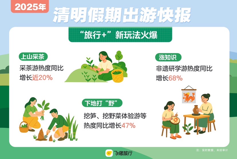 除传统的踏青、赏花以外,部分“旅行+新体验”正快速崛起。飞猪数据显示,清明假期采茶游热度同比增长近20%,包含挖笋、挖野菜体验在内的旅游热度同比增长47%,杭州、湖州、成都、武夷山、宣城等是挖笋采茶游的热门区域。