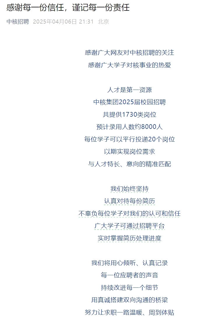 中核招聘:感谢每一份信任,认真对待每份简历