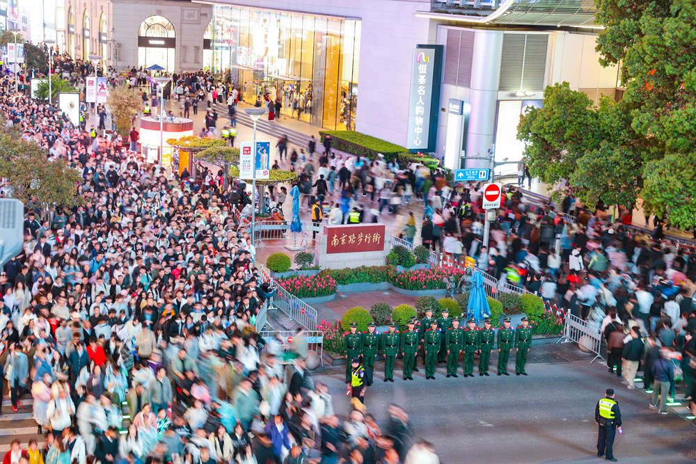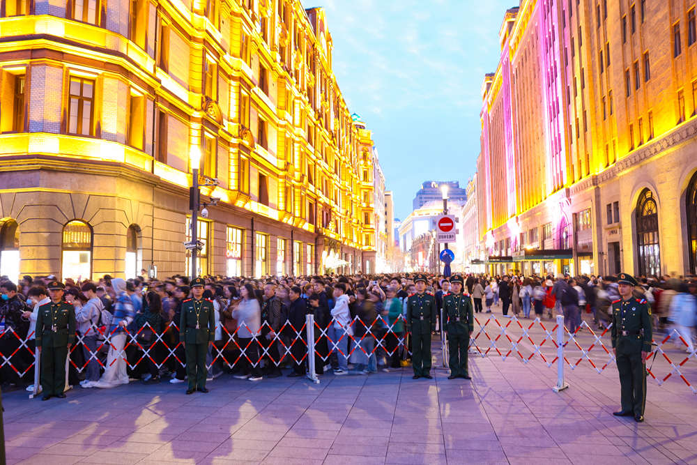 清明假期上海武警官兵坚守外滩执勤岗位,重要路口设置“环岛”式双向隔离人墙