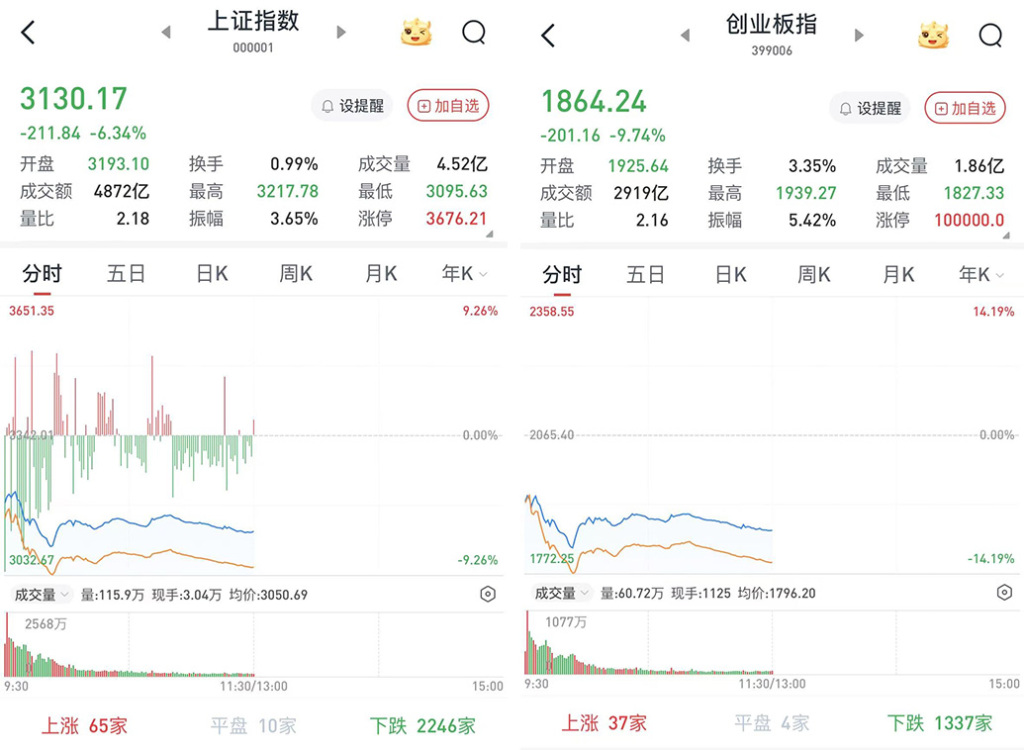 至午间收盘,上证综指跌6.34%,报3130.17点;科创50指数跌6.71%,报949.73点;深证成指跌8.01%,报9535.1点;创业板指跌9.74%,报1864.24点。
