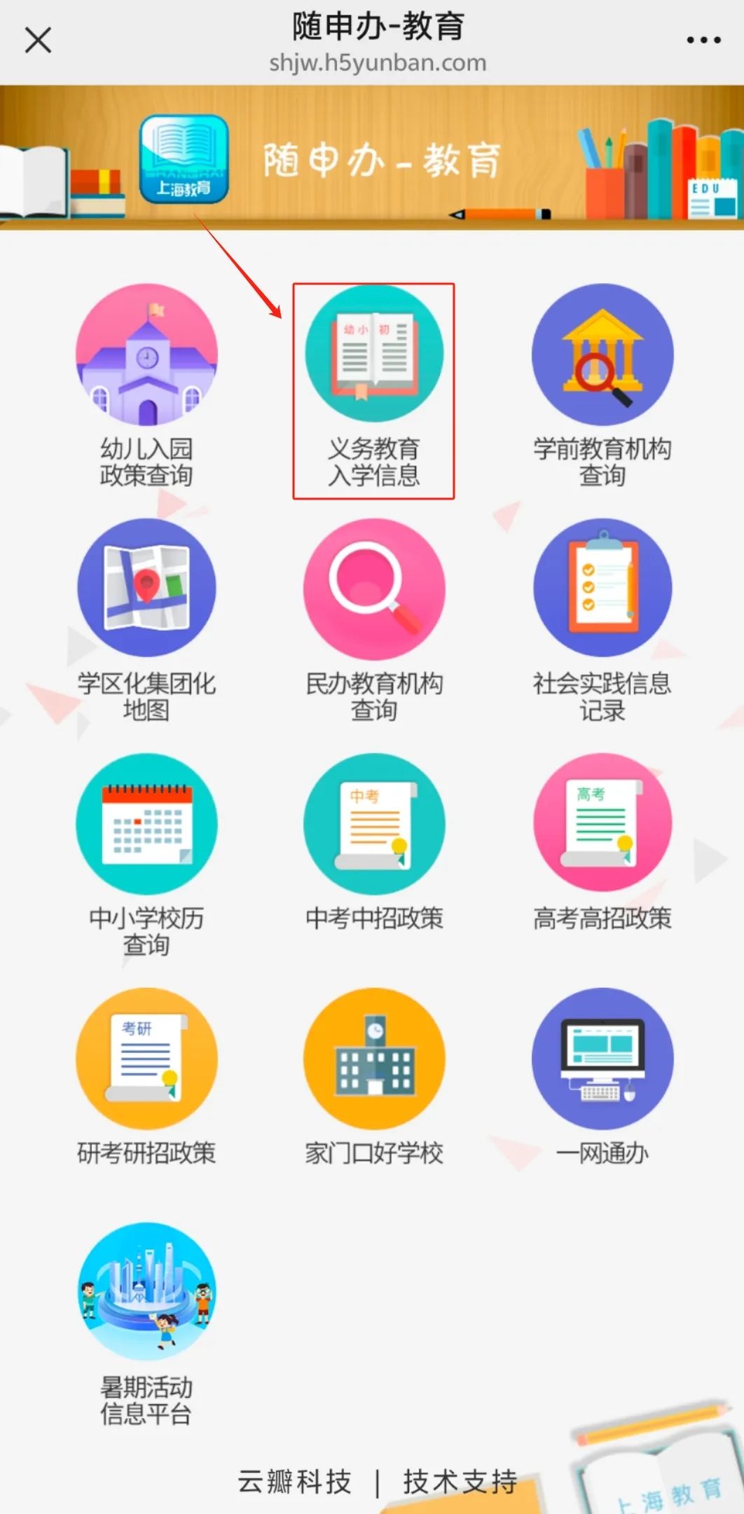 步骤2:在随申办-教育页面点击“义务教育入学信息”,即可查看本市各区义务教育阶段学校今年的招生入学政策详情。