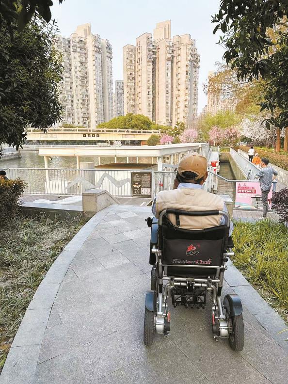 记者跟随刘老伯前往现场实地查看。只见他坐上电动轮椅车,用右手小心翼翼地控制着操纵杆,调整着车辆的方向,尽量紧贴着镇坪路辅路靠近上街沿的一侧行驶。在道路尽头右转后,轮椅车缓缓驶上人行步道,写有“西康路码头”字样的一块指示牌映入眼帘。抬头看去,道路两旁栽种着大片樱花和绿树,树荫掩映下,很多健身爱好者在这里慢跑,数位老人正相互搀扶着在步道上慢走。继续向前,一段木质的道路直通码头。