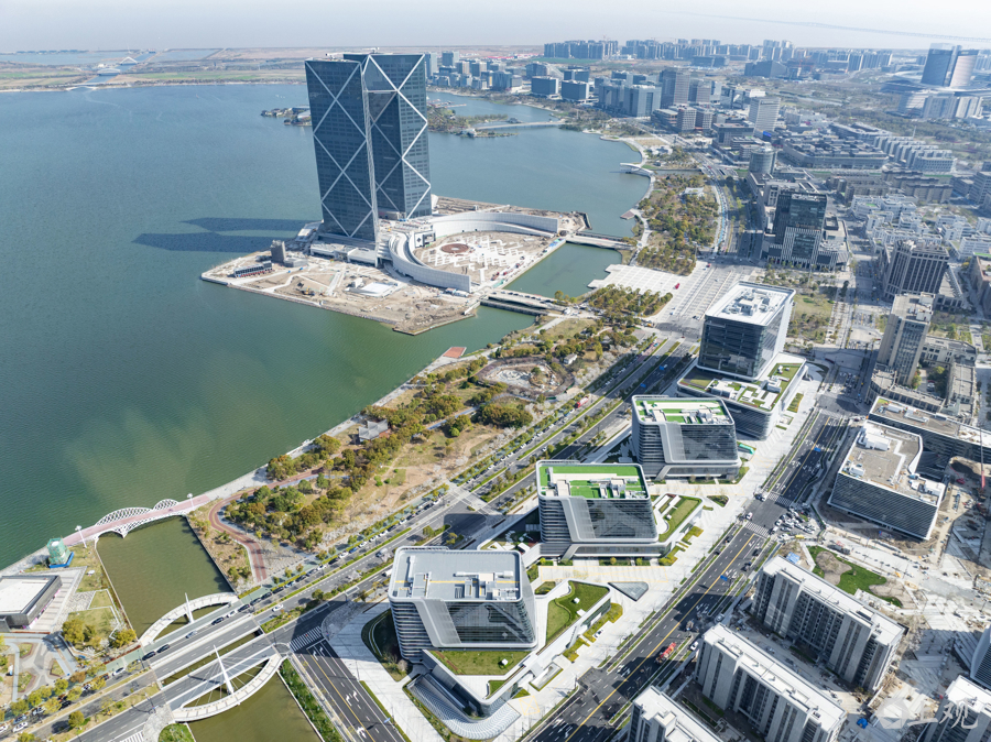 两栋高近200米的双子塔楼以独特的“1”字相向而立,中间留白,顶部通过锥形体空中连廊衔接,以“时代之门”的建筑意象,勾勒出临港对接国际的开放姿态。