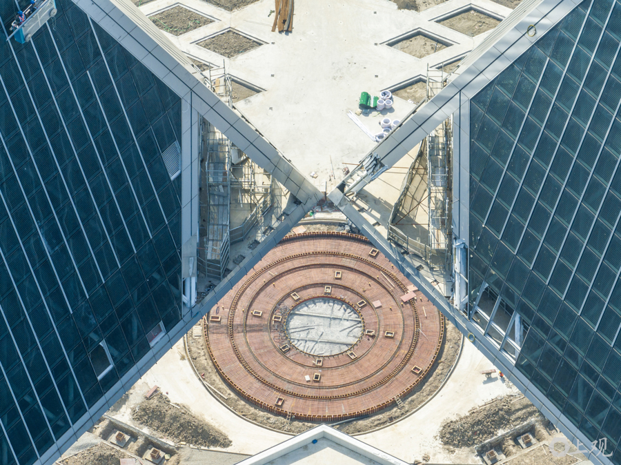 连接南北两座塔楼的钢结构锥体处外立面幕墙正在进行最后收尾。