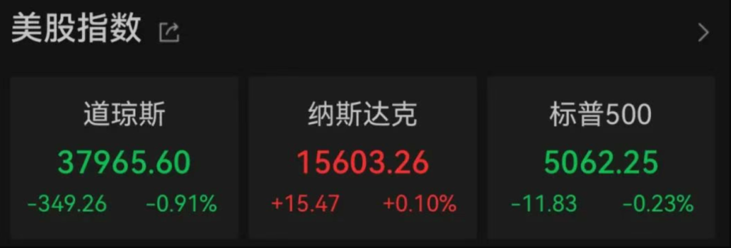 截至周一收盘,道琼斯指数跌0.91%,报37965.60点;标普500指数跌0.23%,报5062.25点;纳斯达克综合指数涨0.1%,报15603.26点。
