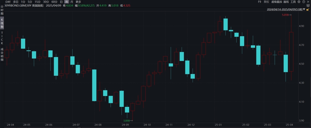 据彭博社报道,当地时间4月8日,美国国债暴跌,历史性抛售导致所有期限的债券收益率在交易期间上升了至少20个基点,其中30年期债券收益率在尾盘上涨近23个基点,创下2020年3月以来的最大单日涨幅。