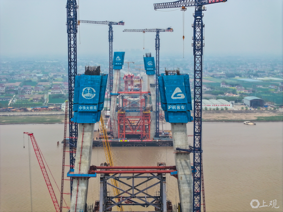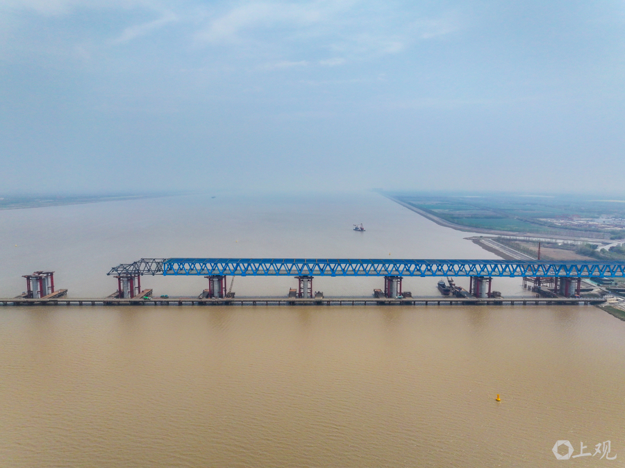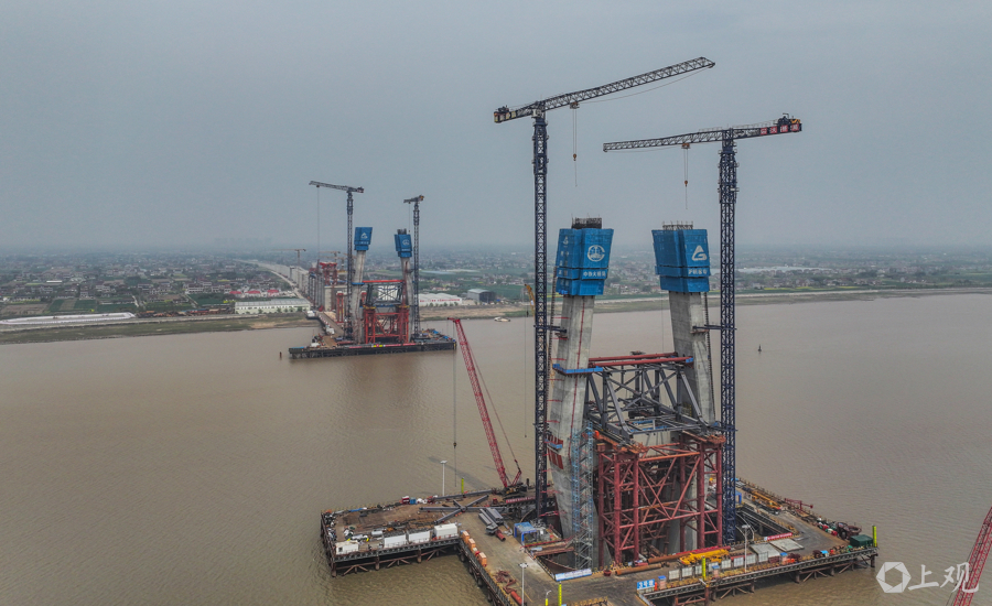 2025年4月9日,崇启公铁大桥主塔施工达103米,突破百米大关。
