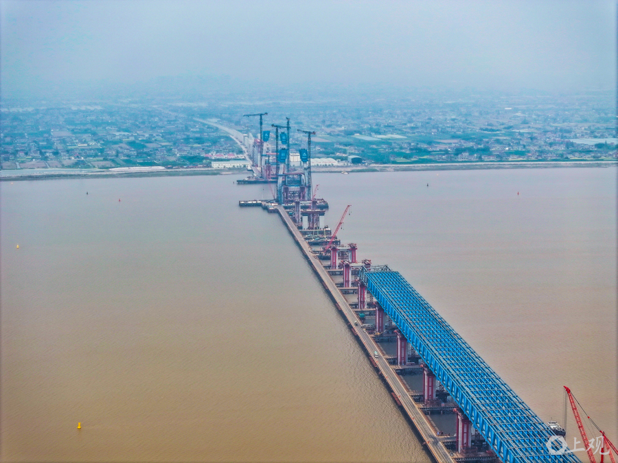 场面 | 崇启公铁长江大桥施工高度突破百米大关