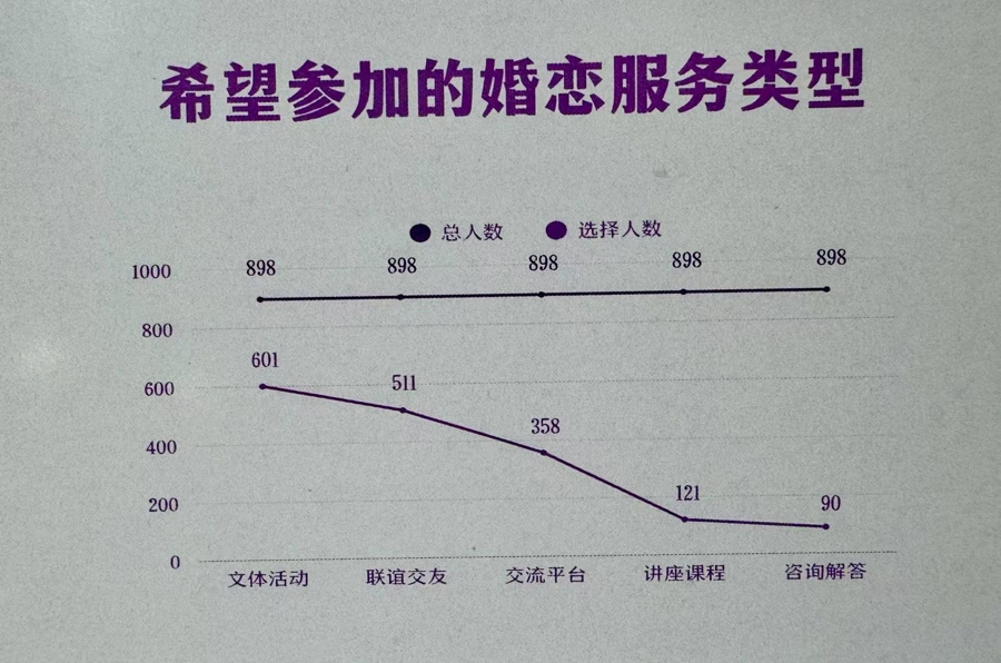 在“婚恋对象选择的考虑因素”一题中,受访者需对8个选项按重要程度进行排序。结果显示,“三观相合”成为排序第一的选项,且分值远远拉开其他选项,其后是健康状况、外表形象、兴趣爱好,显示出“有趣、健康最好有点好看的对象”成为“理想对象”。而传统婚恋市场中流行的学历水平、经济条件、家庭背景、职业类别则“断崖式”成为排序靠后的选项。复旦大学社会学系副研究员杜世超认为,这说明择偶正从“地缘”转化为“趣缘”,而“三观相合”与学历、经济等“量化标准”相比较,更需要通过交流尤其是线下沟通来判定。这与另一题“希望参加的婚恋服务类型”的调研结果互为印证——67%的受访者选择“文体活动”,其中又有64%的受访者选择了“联谊交友”。这表明,青年群体更多地希望通过文体活动、联谊交友等形式搭建交流平台,拓展人际关系的广度和深度。