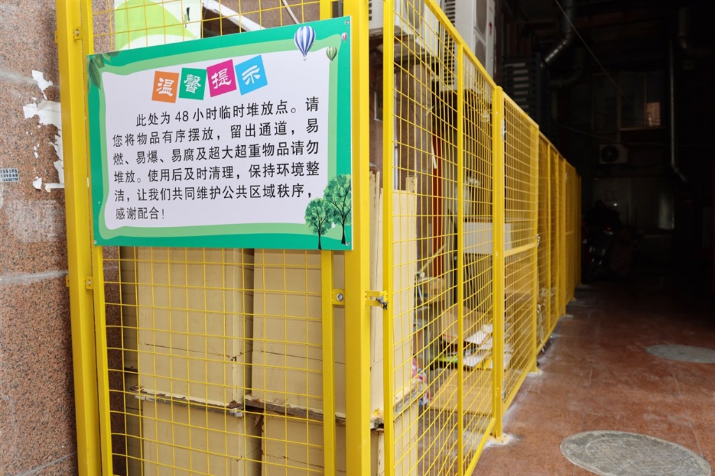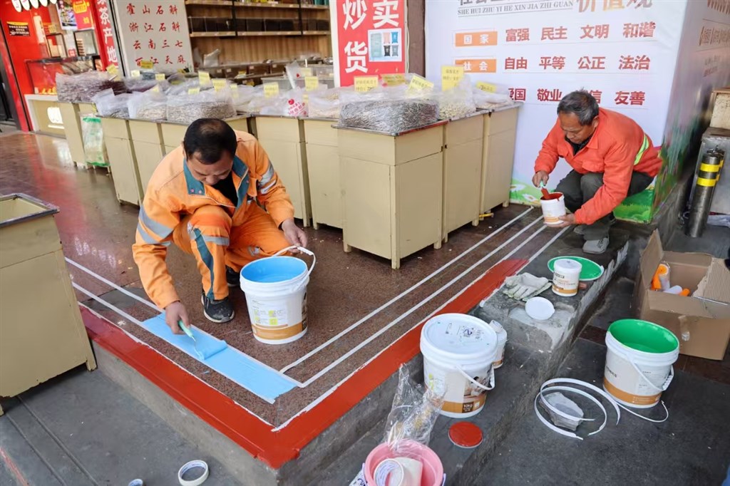 转机出现在2025年初。朱泾镇党委将公园路纳入党建引领网格治理试点,创新推出“空间规划+契约治理”双轨模式。城建部门耗时一周完成沿街测绘,划设彩、红、黄、蓝四色标线:彩线界定2米外摆经营区,允许生鲜店摆放高度1.2米以内的货架,高峰限定时段可延至红色标线;黄线设置网状隔断,在背街选定区域规范临时分类堆放,明确清理时间;蓝线延伸非机动车停车位,扩大停车容量。
