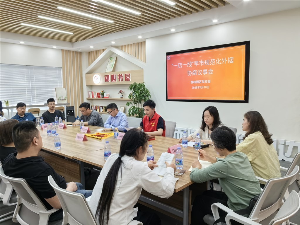 4月10日下午,金山区朱泾镇西林街区万安家党群服务站内,公园路汇“泾”彩商户协商共治联盟代表、文商路“心邻”巾帼小组代表、西林街“万里”青年创业社团代表以及街区党支部书记、第三综合网格调度员围坐在长桌前,一场关于“’一店一线’早市规范化外摆”的协商议事会讨论正酣。