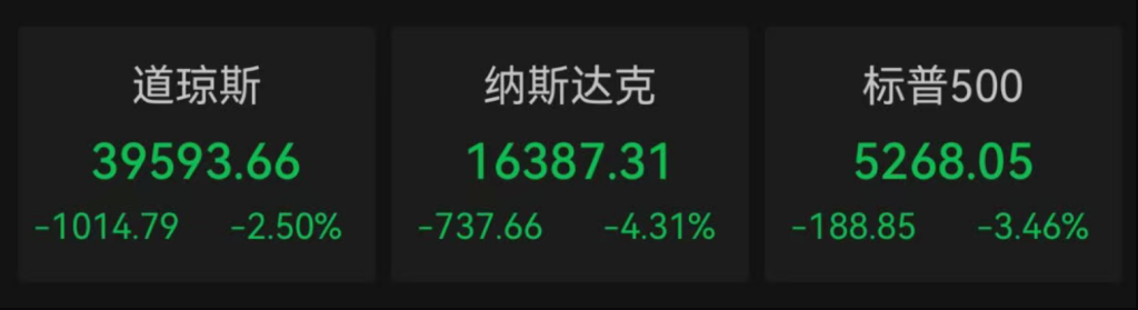 截至当地时间4月10日收盘,道指下跌1014.79点,收于39593.66点,跌幅为2.50%;标普500指数下跌188.85点,收于5268.05点,跌幅为3.46%;纳指下跌737.66点,收于16387.31点,跌幅为4.31%。