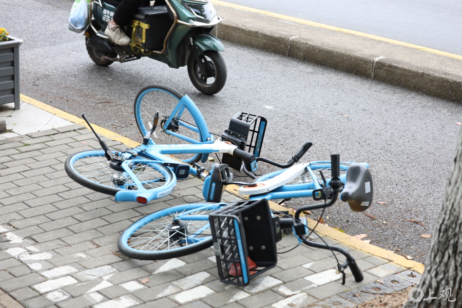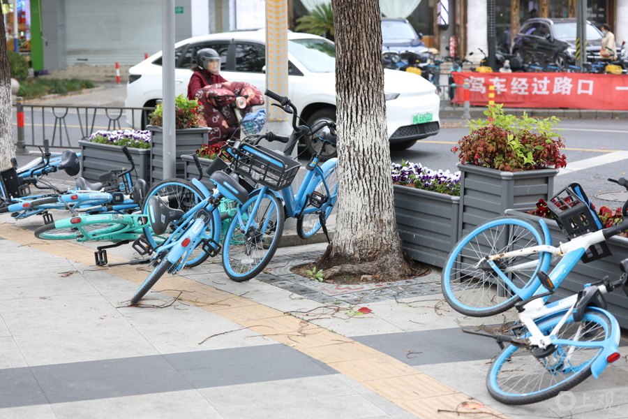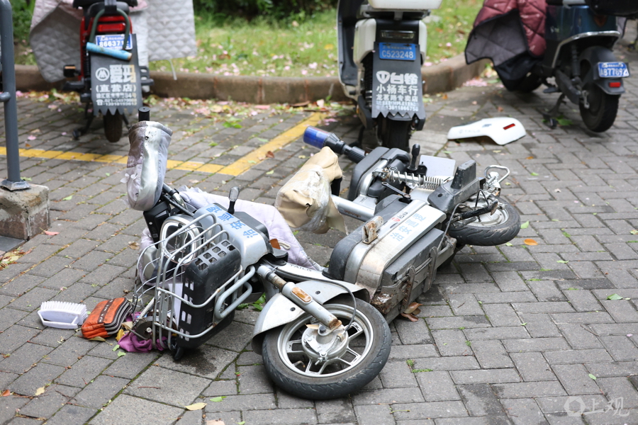 大风袭来,大量自行车和电动车被吹倒。