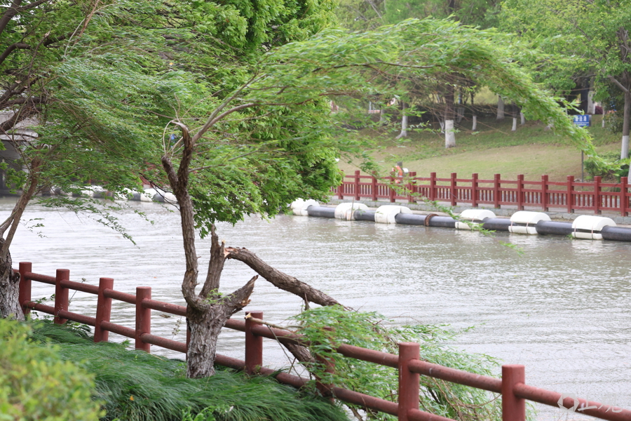 闵行古美新泾港河边一棵柳树被拦腰吹断。