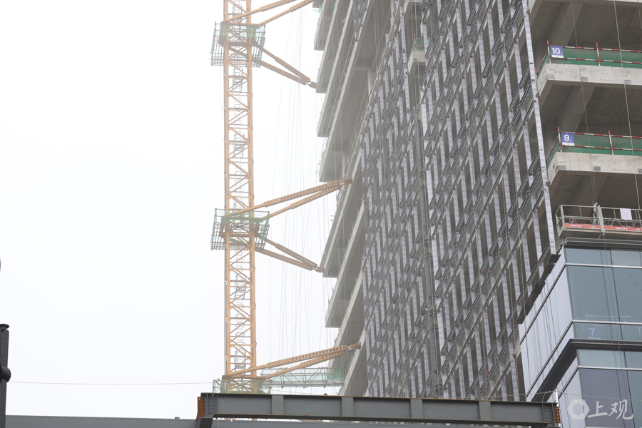 工地停工。闵行七宝一处在建高楼的塔桥被多重加固。