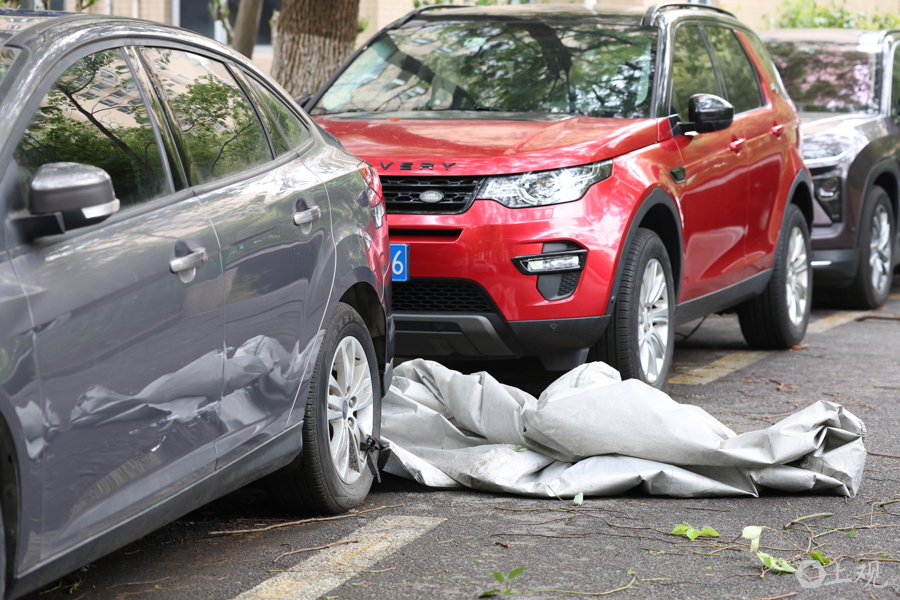 一辆轿车的车衣被吹得剥落在地。