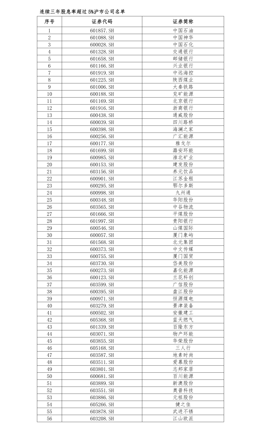 分红水平稳步提升,56家沪市公司连续三年股息率超5%