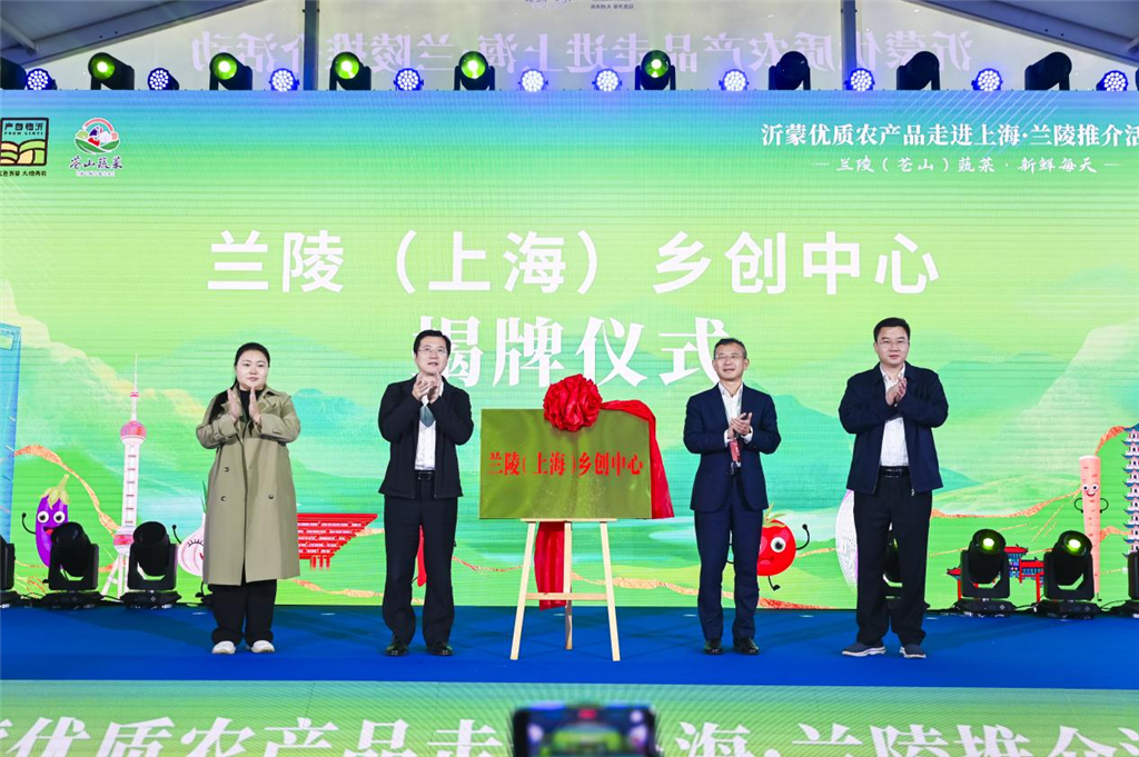 上午9点,沂蒙优质农产品走进上海·兰陵推介活动与首届山东绿色蔬菜产业博览会开幕式同步启动。活动现场,推介活动与开幕式实时连线,实现"双城互动",在两地嘉宾的共同见证下,新华社上海分社社长王永前,上海临港经济发展(集团)有限公司党委委员、副总裁孙萌,山东省供销社农产品有限公司总经理徐新芝,兰陵县委副书记孙虎上台,为兰陵(上海)乡创中心揭牌。