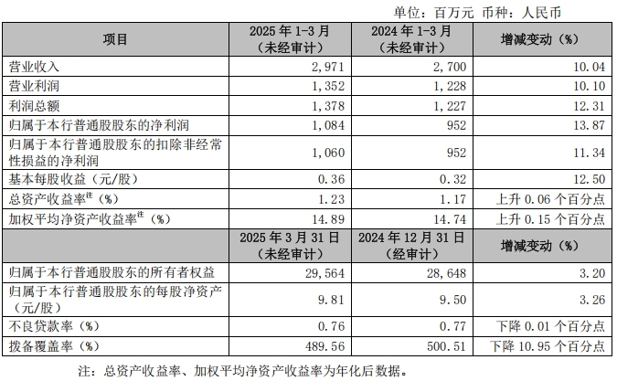 4月14日,常熟农村商业银行(常熟银行,601128.SH)披露的2025年一季度业绩快报公告显示,2025年1-3月,常熟银行实现营业收入29.71亿元,同比增长10.04%;实现归母净利润10.84亿元,同比增长13.87%。