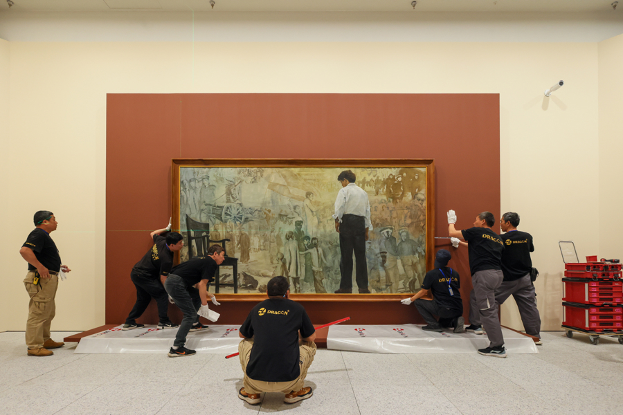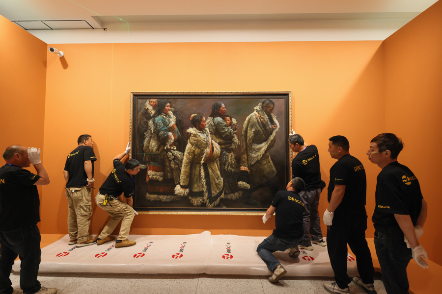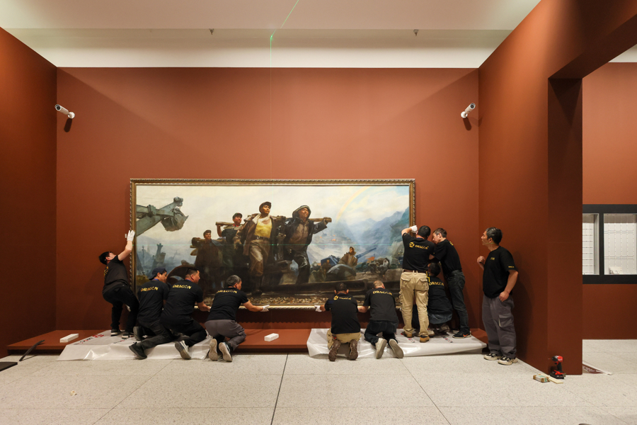 作为海派艺术名家陈逸飞迄今规模最大、涵盖内容最完整的回顾展,将于4月26日起亮相浦东美术馆的“时代逸飞:陈逸飞回顾展”未展先热,引人期待。昨天下午,《踱步》《开路先锋》《山地风》三件重磅巨幅展品由工作人员小心翼翼地剥离封箱胶带,露出真容,依次上墙、微调、加固,展览进入紧张的布展中。